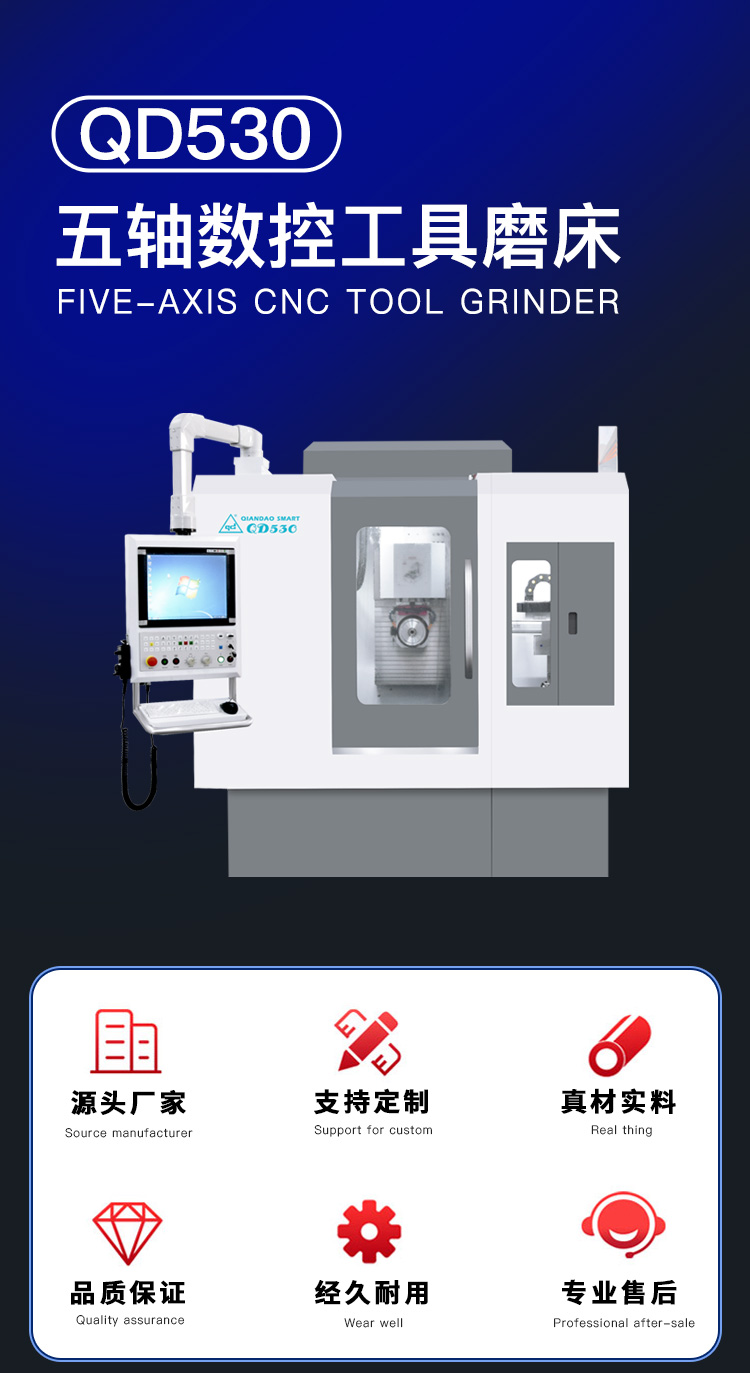 QD530是千岛公司新研发的五轴五联动数控工具磨床,是一款高性价比刀具磨床,适用于生产或修磨各类铣削类刀具、钻削类刀具、成形刀具等。