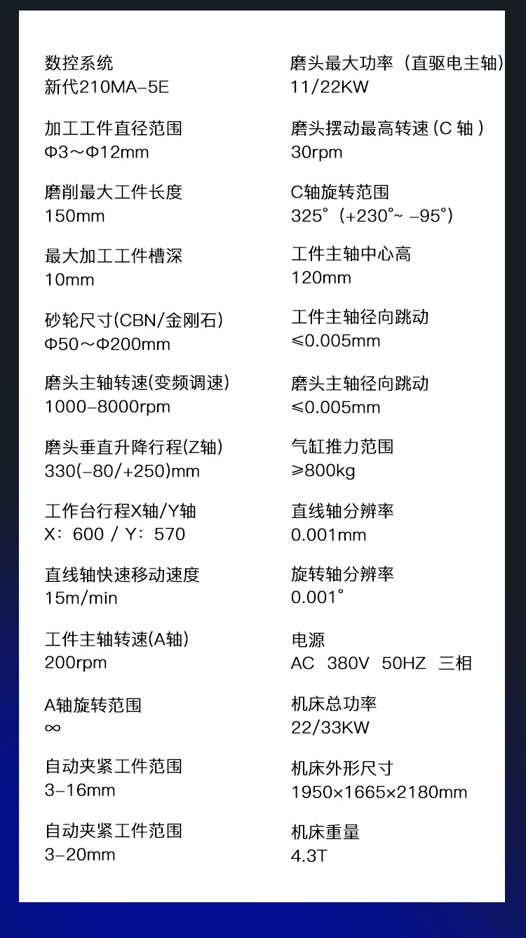 机床采用高精度、同步直驱变频电主轴,主轴有两组砂轮法兰,每组法兰可同时装2~4片砂轮,根据磨削工艺,砂轮组换位快捷,可充分满足各种刀具磨削需求。
